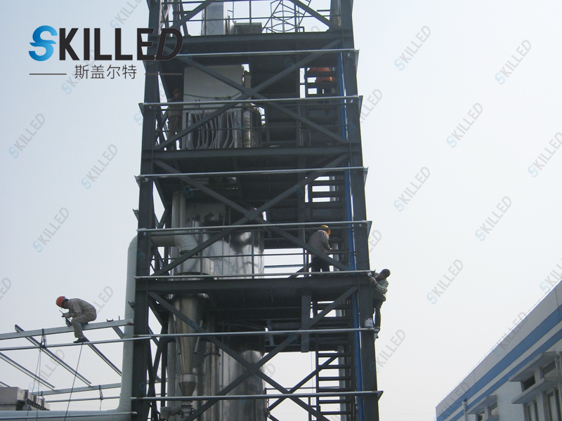 料液通过隔膜泵高压输入,喷出雾状液滴,然后同热空气并流下降,大部分粉粒由塔底排料口收集,废气及其微小粉末经旋风分离器分离,废气由抽风机排出,粉末由设在旋风分离器下端的授粉筒收集,风机出口还可装备二级除尘装置,回收率在96-98%以上。