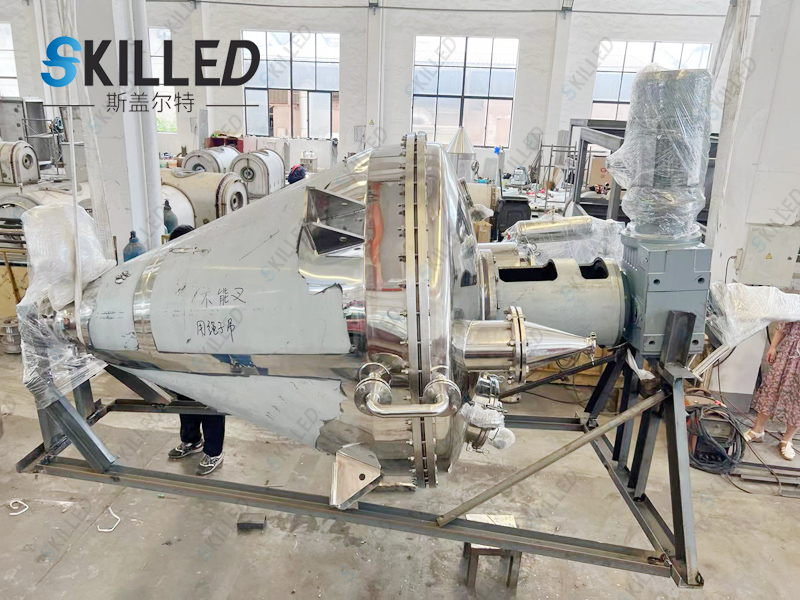 工作原理本机由加热锥体设有加热夹套,热源为热水、导热油或低压蒸汽,从而使锥体内壁保持一定的的温度。变频调速电机经平行斜齿轮减速机,驱动单螺带搅拌器旋转,带动物料沿锥型筒旋转并自下而上提升,物料到达高点后由重力和惯性作用,自动流向旋涡中心回到锥型筒体底部,整个过程使物料在锥型筒体内强制加热,相对对流、掺混,热量在物料中相互扩散,使物料作全方位的不规则往复运动,完成物料同单螺带和筒壁表面进行高频率传热交换,在短时间内达到加热干燥的效果。从而使物料内部水份不断蒸发,在真空泵的作用下,水蒸汽由真空泵引出,如须回收液体可加冷凝器、回收液储罐回收。干燥完成后,打开下部的出料阀出料。